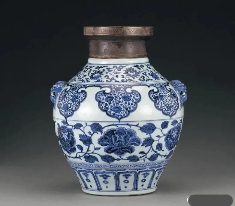 这件元青花缠枝牡丹纹兽耳大罐,高度在40.4厘米,罐肩颈部绘缠枝花卉纹,腹部绘缠枝牡丹纹,胫部绘莲瓣纹。所绘牡丹饱满圆润,一正一反俯仰相映,增添许多自然灵动之气。罐两肩饰以兽首为耳,瓷塑面貌生动,威猛亦不失天真稚气。全器所用青花发色鲜艳,明翠欲滴,为元代青花器之佳作。