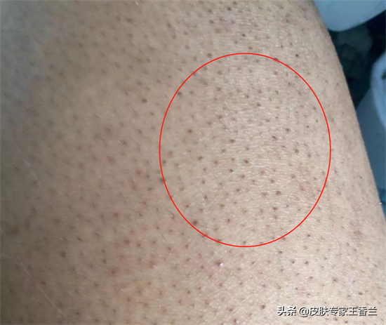 在胳膊外侧、大腿外侧甚至脸颊变都长满这样的小疙瘩,一般都呈肤色或者黑点状,摸起来还疙疙瘩瘩,漏在外面不太美观,因为有点像鸡皮上的小疙瘩,俗称“鸡皮肤”,我们医学上称之为毛周角化症。