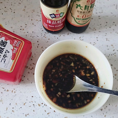 3、准备酱料汁:蒜泥、两勺辣椒酱、两勺蚝油、两勺生抽、一勺酱油、一勺白糖搅拌均匀备用~