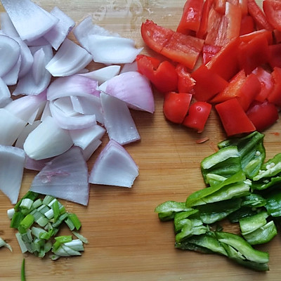 7、加入青红椒和洋葱继续翻炒三分钟左右,加入少量的鸡精和盐调味,撒上葱花即可出锅!