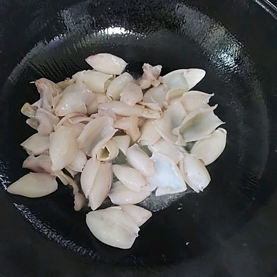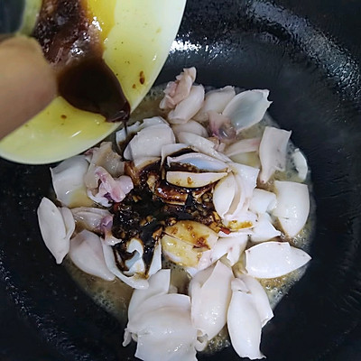 4、锅中热油爆香蒜后加入鱿鱼爆炒三分钟左右~
