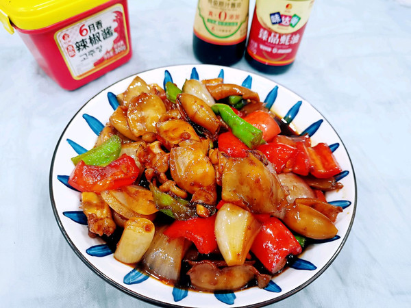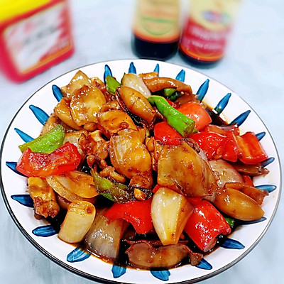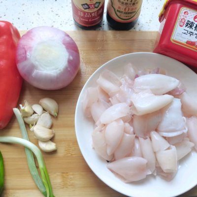 鱿鱼 500g 青椒 1个 红椒 1个 蒜 1头 葱 2根 蚝油 2勺 盐 适量 生抽 2勺 酱油 1勺 白糖 1勺 鸡精 少量