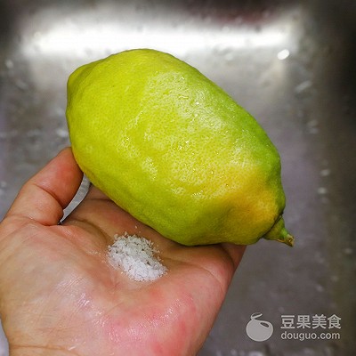 2、用盐在柠檬皮表面搓一搓,用清水冲洗干净,再用热水迅速淋烫一下,洗干净整个柠檬。