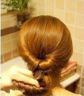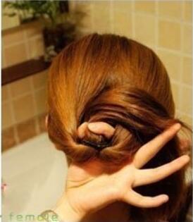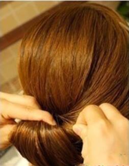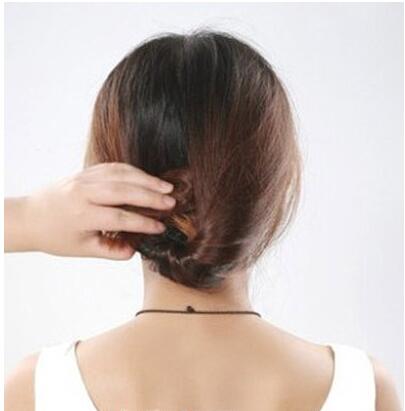步骤三:将拧转过的发辫盘旋塞进发根上方掏开的发洞中去。