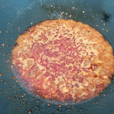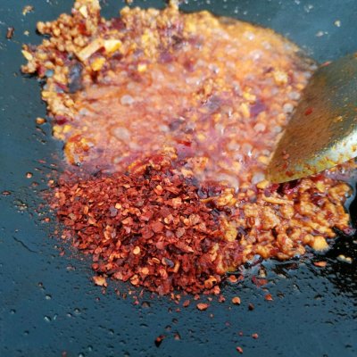 3、放入豆瓣酱炒出红油,再倒入辣椒面翻炒均匀。