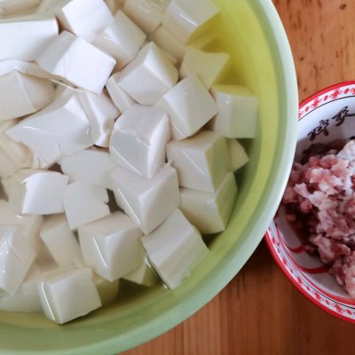 1、准备以上食材。 1.豆腐切块。 2.猪肉剁成肉末。
