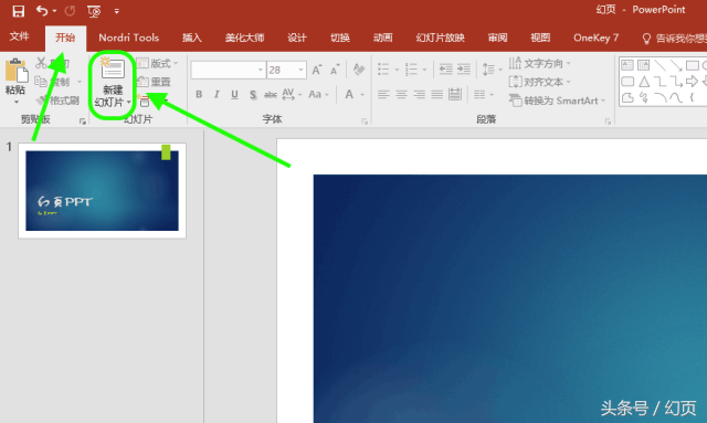 5、要继续制作下一张PPT,点击顶置菜单栏中的“开始”,单击“新建幻灯片”。
