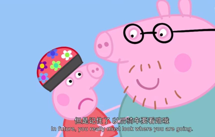 Peppa骑在自行车上面,Daddy Pig扶着她,Peppa紧张的说Don’t let go, Daddy!爸爸,不要放手啊。后来又说了一句Hold on, Daddy! 紧紧抓住啊,爸爸。