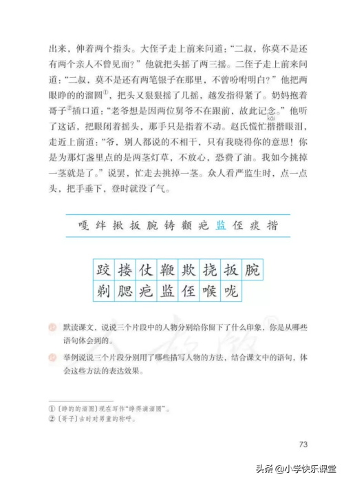 1.默读课文。说一说三个片段中的人物分别给你留下了什么印象,你是从哪些语句体会到的。