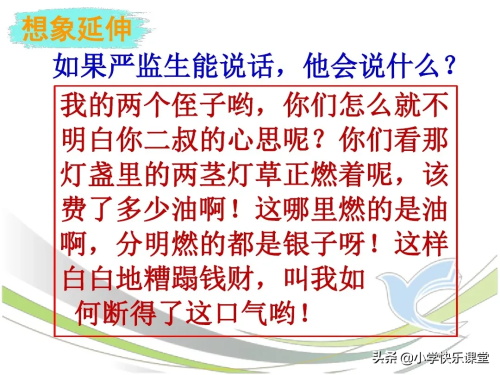 那灯盏里的两茎灯草正在燃着,该费多少油呀,这哪是在烧油,分明燃烧的都是银子,这样白白糟蹋银子,叫我如何断得了这口气。