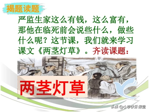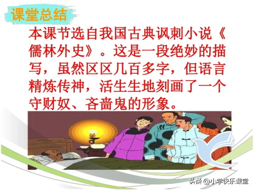 《两茎灯草》记叙了严监生临终前因灯盏点了两茎灯草,伸着两根指头不肯断气,直到赵氏挑掉了一茎灯草,他才咽气的故事,刻画了一个吝啬鬼的形象。