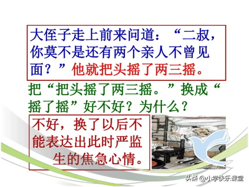 2.大侄子走上前来问道:“二叔,你莫不是还有两个亲人不曾见面?”他就把头摇了两三摇。把“把头摇了两三摇。”换成“摇了摇”好不好?为什么?