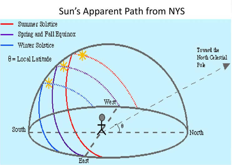 北半球的夏季(5月、6月和7月)中,太阳从东北方向升起,在比最正上方那一点(在纬度更高的地区,这一点会更低)稍稍偏南的位置达到最高点,最后在西北方向落下;然而,在南半球的夏季(11月、12月和1月)中,太阳从东南方向升起,在比最正上方的那一点(在纬度更高的地区,这一点会更低)稍稍偏北的位置达到最高点,最后在西南方向落下。