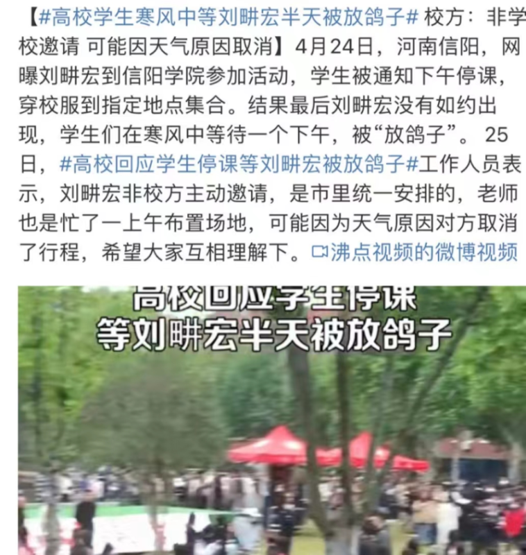 4月24日这天,信阳一个学院全体学生接到通知,要学生老师全部停课在操场等待刘畊宏夫妇的到来。