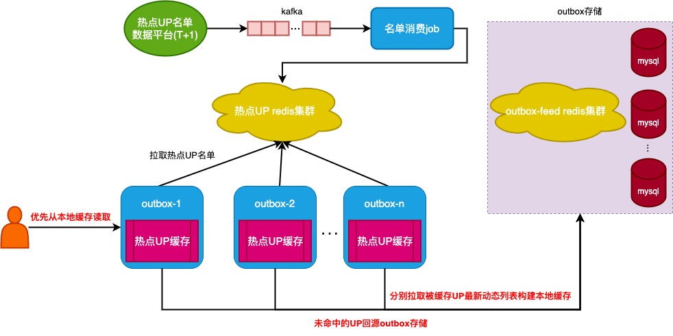 因为设定的粉丝数阈值比较高,所以热UP的数量变更不会特别频繁。基于此特点,我们给出的本地缓存整体方案是(如图3):从数据平台每天离线T+1地统计出所有粉丝数达标以及因掉粉粉丝数从达标变为不达标的UP名单,并通过kafka推送写入redis。当outbox服务实例启动时,会从redis拉取到全量名单,并从outbox redis分别拉取这些被缓存UP的最新动态列表,构建于本地缓存中。而启动后的outbox实例每当感知到来自数据平台的被缓存UP(包括需要删除的)名单推新时,也会拉取推新后的名单,但只构建当前未被缓存的新UP,并删除粉丝数低于阈值的UP缓存。当用户获取feed流“拉”其关注的UP的outbox时,优先从本地缓存获取UP的最新动态列表,未命中的UP才回源拉,以此缓解outbox redis的读扩散压力。