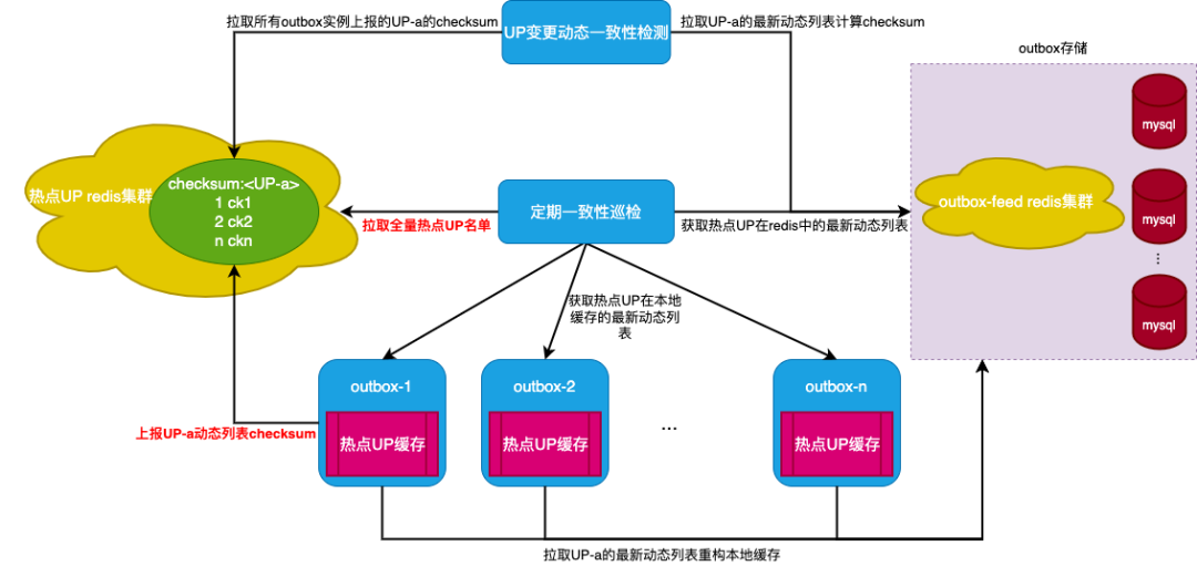 采用无过期常驻缓存的方案也让我们担心本地缓存中的值与outbox redis中的值会长期不一致。为了确保一致性,我们在方案中加入了一致性检测的功能。我们提供了”UP变更时检测“与”定期巡检“两种模式(如图5)。每个outbox实例每次回源重构某个UP的本地缓存后,会计算出该UP最新动态列表的checksum并存入redis中。UP变更时检测则会在某个被缓存UP发布/删除动态触发所有outbox实例重构本地缓存后,对比该UP在所有实例本地缓存中最新动态列表的checksum与在outbox redis中最新动态列表的checksum是否一致。而定期巡检则会在每天固定的时间,对比全量被缓存UP在所有实例本地缓存中的最新动态列表与在outbox redis中的最新动态列表是否一致。无论在”UP变更时检测“还是”定期巡检“的过程中,一旦检测到被缓存UP在本地缓存中的值与outbox redis中的值不一致时,皆会将该UP的”动态列表变更“事件再次广播到所有outbox实例触发对该UP缓存的重构,以实现自动修复不一致的功能。