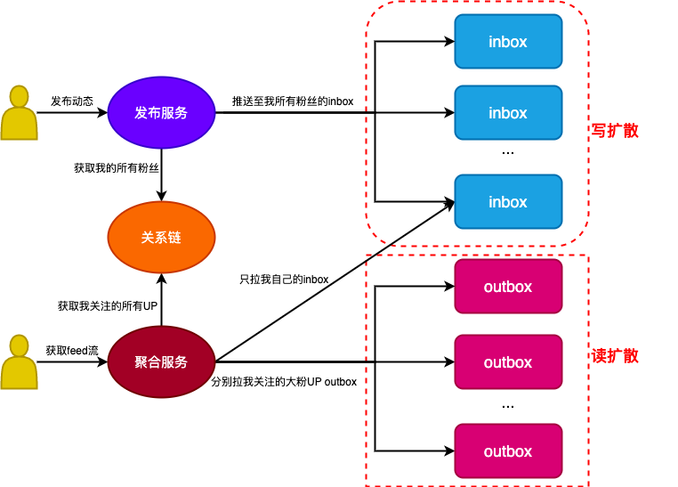 在分析outbox redis集群压力过大的原因之前,先简单介绍一下拉取动态时间线feed流的实现方案——”推拉结合“(如图2)。在动态系统中,为每个用户都分别维护了一个收件箱”inbox“与一个发件箱”outbox“。inbox存储用户关注的UP发布的所有动态,outbox存储了用户本人发布的所有动态。”推“是指一个UP发布的动态会推送至其所有粉丝的inbox中。而”拉“则是指从用户关注的UP的outbox中分别拉取一页feed流。我们一般对于粉丝数量大的UP主(简称大粉UP)采用拉的模式,其他UP主采用推的模式,因为”推“大粉UP写扩散比较严重,会影响写入性能并大幅提升存储空间。所谓的“推拉结合”,就是从用户的inbox拉取一页feed流以及从用户关注的所有未做推处理的大粉UP的outbox分别拉取一页feed流,合并并按发布时间降序排序取TopN最终形成用户的一页feed流。不难发现,对于”拉“outbox而言存在着用户关系链的读扩散,所以,对outbox redis集群读放大较严重(几百甚至上千倍)。引入”推“inbox的本质其实是缓解”拉“outbox读扩散的压力,因为用户关注的且已经做推处理的UP发布的动态可以直接从用户的inbox中得到,无需去拉他们的outbox。然而,高热事件引发的大量用户同时访问带来的瞬间高并发再叠加上outbox的读放大效应,依然足以将outbox redis打过载。