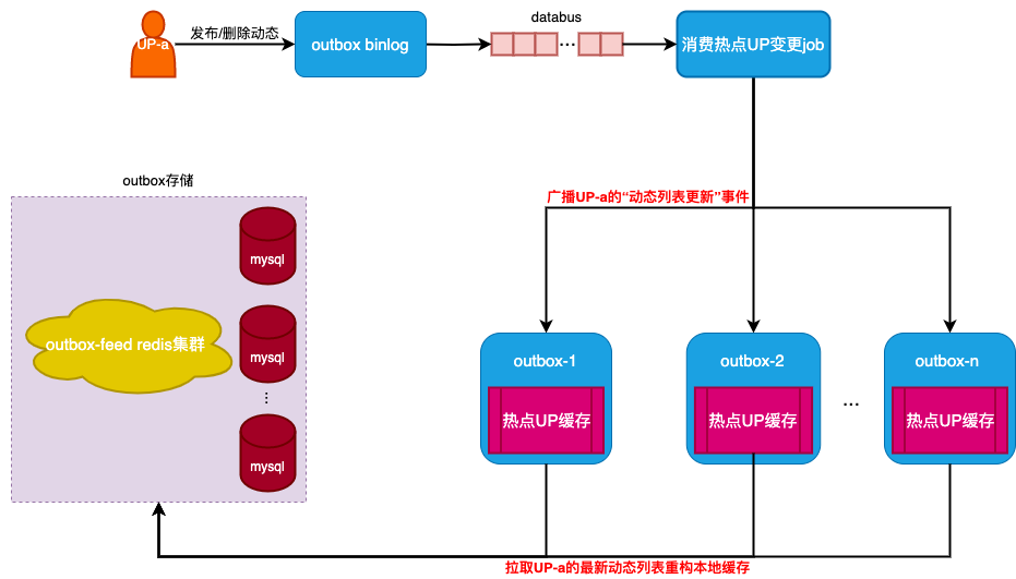 被缓存UP的最新动态列表不是一直不变的,当UP发布或者删除动态后,需要及时回源outbox redis获取该up变更后的最新动态列表并重构其本地缓存。所以,该方案还需要考虑回源对outbox redis的压力问题。在万级别的热key个数加上百级别的实例规模场景下,如果我们采用简单、常规的对每个被缓存UP设置一个较短过期时间,过期后回源重构则容易造成大量key同时过期回源导致outbox redis集群瞬时压力过大,产生雪崩现象。因此,我们给出的回源重构方案是”变更广播+异步重构“(如图4)。在这个方案中,outbox实例本地缓存的UP最新动态列表是常驻不过期的。当某个被缓存的UP发布或删除动态时,会广播该UP的“动态列表变更”事件给所有outbox实例,outbox实例接收通知后异步回源并重构该UP的本地缓存。因为被缓存UP变更频次极少,所有这种回源重构方式对outbox redis的压力也很小。