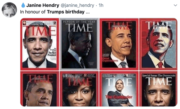 美国网民在特朗普生日那天创造了一个新话题——所有的生日都很重要(All Birthdays Matter),黑人的了三周的黑人的生命也是生命(Black Lives Matter)抗议活动。此外,6月14日奥巴马日