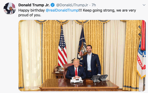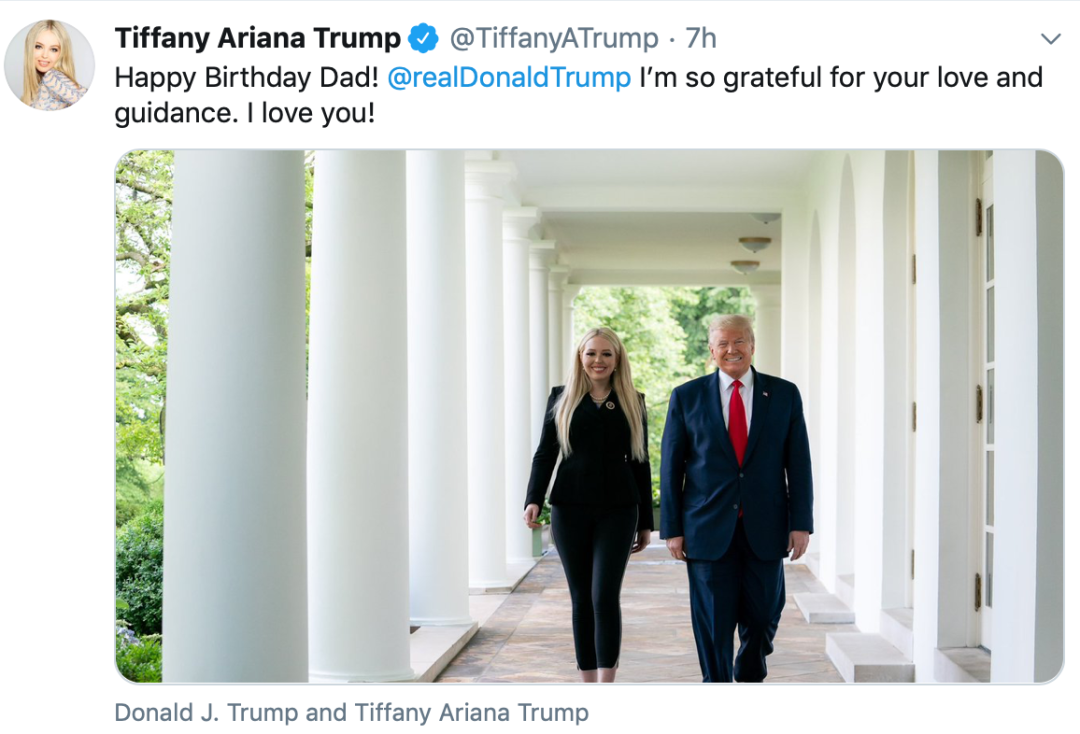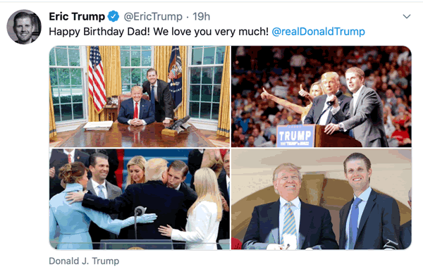 这一天,特朗普的几个成年子女早早在社交媒体上与特朗普合影,祝特朗普生日快乐。伊万卡最初发了一张小时候和父亲的照片,一个小时后发了一张最近和特朗普的照片。大儿子小唐纳德·埃里克·特朗普,第二个女儿蒂凡尼·特朗普也晒照,祝福特朗普。