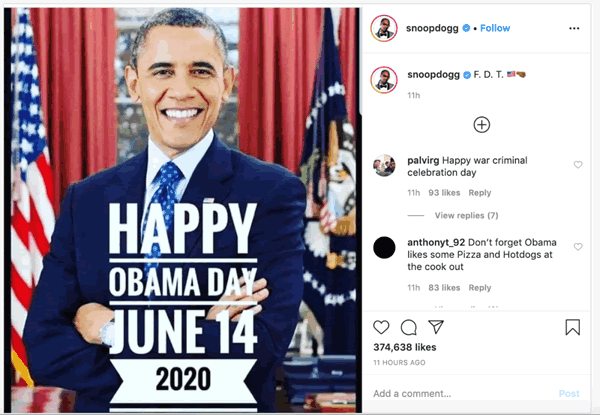 Snoop Dogg、50 cent许多歌手还在社交媒体上与奥巴马夫妇合影致敬。还有些网友晒出以往被白人警察杀害的黑人照片,祝他们生日快乐。