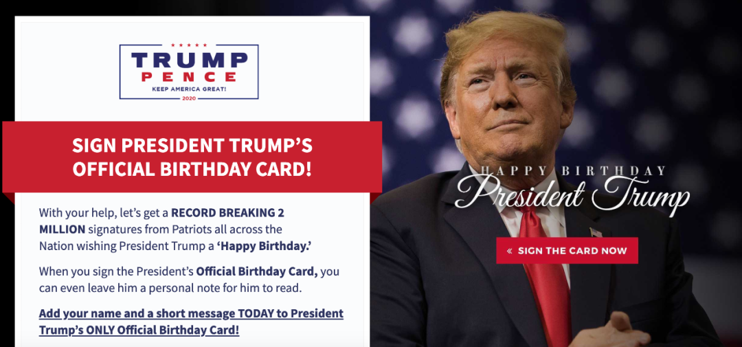 特朗普竞选队邀请人们为特朗普签署生日卡。