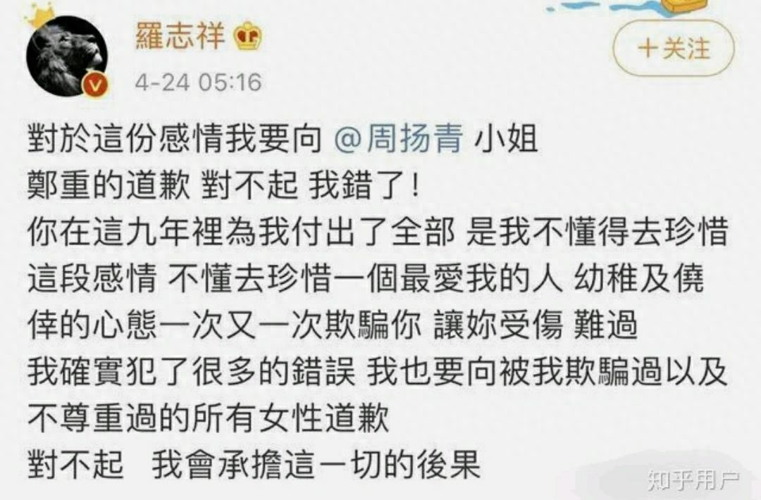 讨罗檄文一出激起微博千层巨浪,在舆论的压力下,罗志祥发文向周扬青道歉:向被我欺骗过以及不尊重过的所有女性道歉。