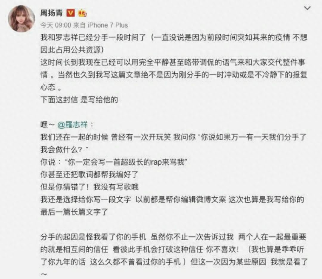 2020年,被罗志祥伤得遍体鳞伤,心死如灰的周扬青发文痛批罗志祥,曝其爱玩多人游戏、旗下艺人与他有不正当男女关系,兔子也要吃窝边草,连自己的御用化妆师也不放过。