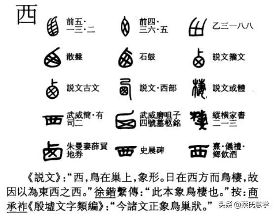 西的意思是西方,本来与作为时间约定的其毫不相干,但是,为什么用源于其的字形来指代西。原因在于,在契约机制中,基于契约双方的关系,形成了约定成俗的尊卑机制,就是以右为尊,以东为尊,这些契约机制就和左右和东西联系起来。