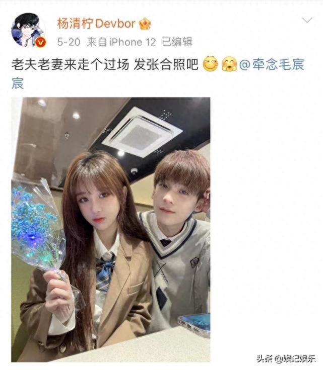 一个月前,杨清柠还艾特毛宸宸,甜蜜地表示:老夫老妻来走个过场,发张合照吧。