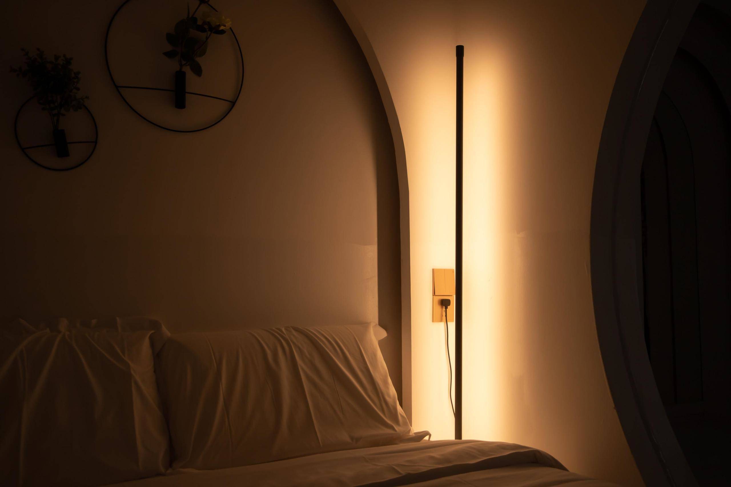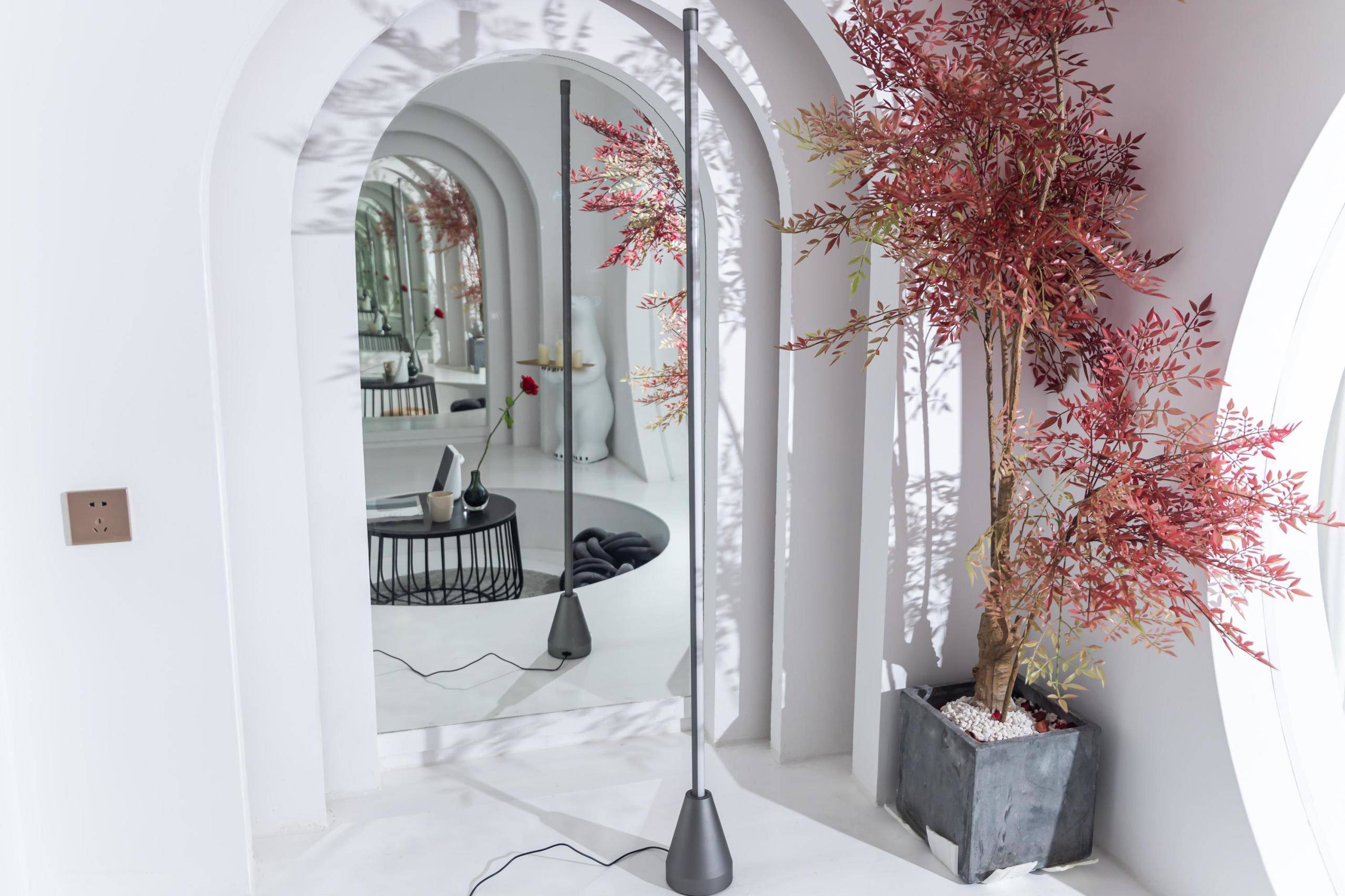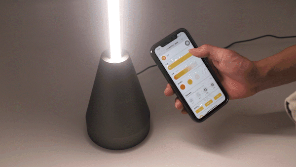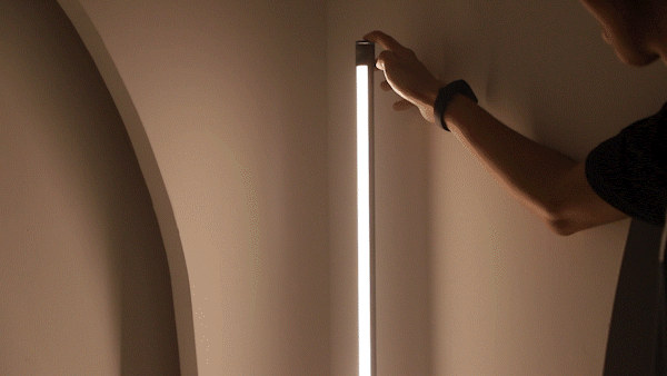 造型是别具特色的圆柱体设计,底座12cm,不占地方,灰枪色的灯体,装饰感科技与神秘感十足。远看是一道光,近看才知道那是灯。