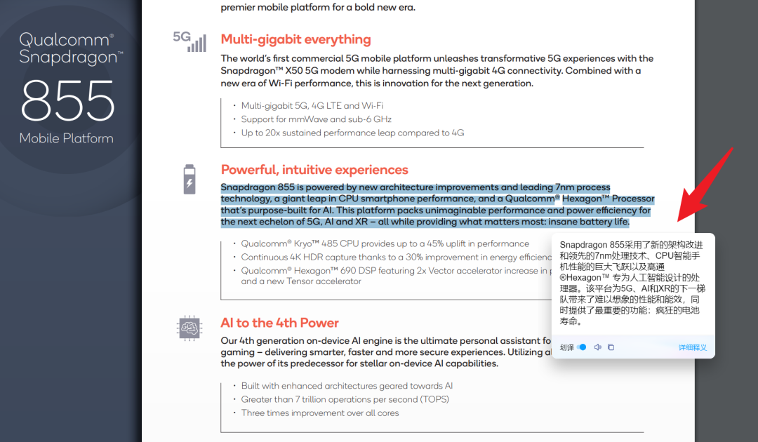 只要用鼠标把外文单词或者句子框选出来,翻译就会自动对它进行翻译,并以弹窗的形式把翻译出来的内容显示在原文旁边,妥妥的啃论文神器: