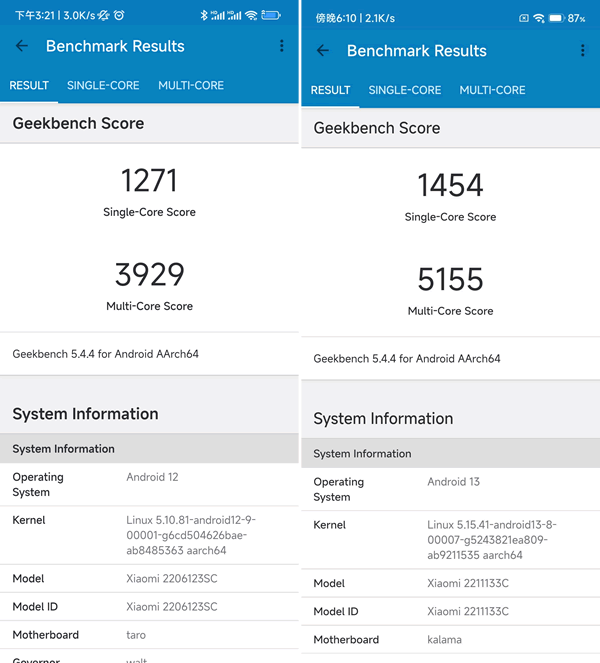 首先是GeekBench 5环节,小米13的单核分数和多核分数为1454分和5155分,与搭载骁龙8+ Gen1的小米12S相比,在单核方面的差距其实并不算大,但在多核方面提升了约30%左右,整体提升还是非常明显的。