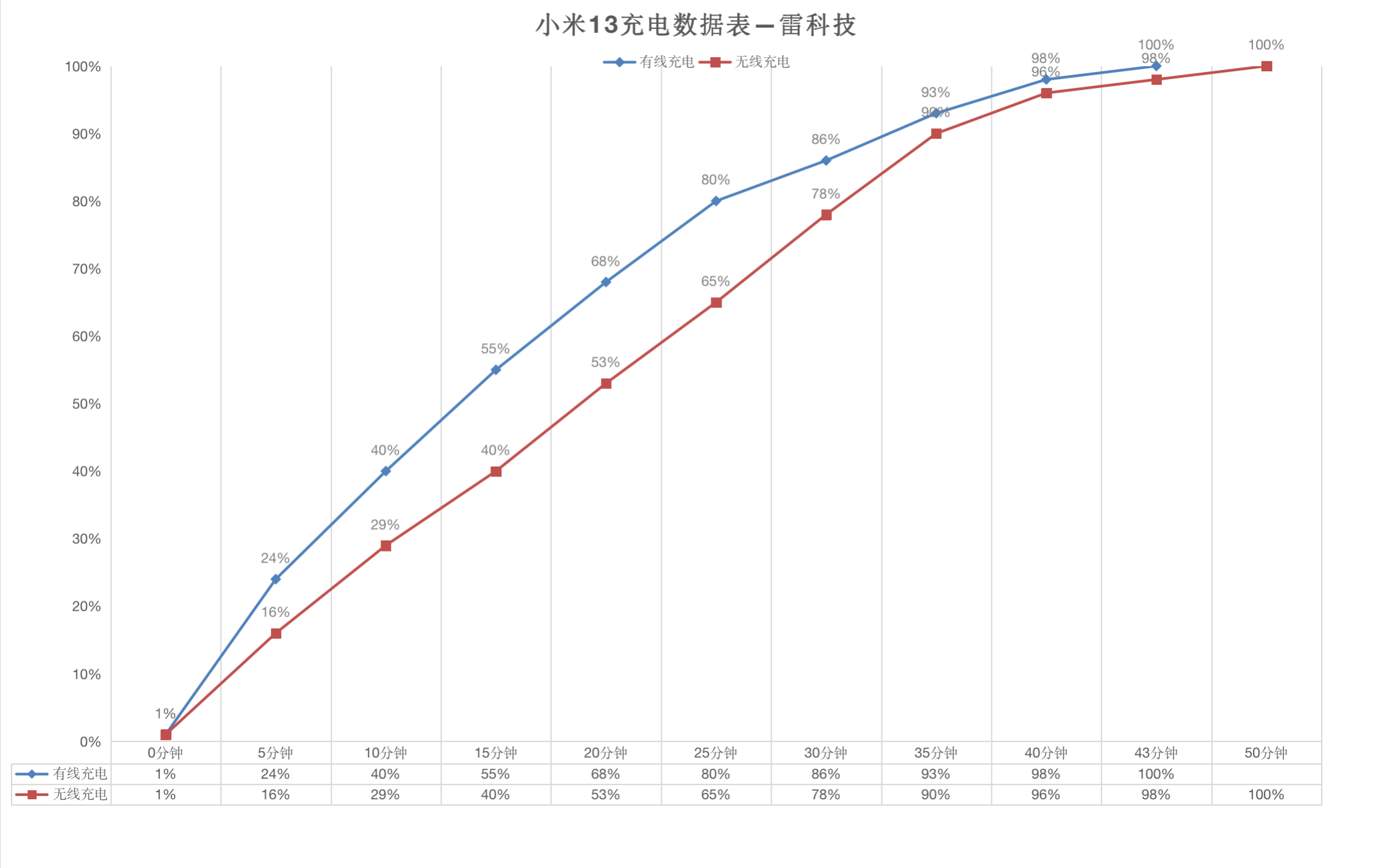 实测小米13的有线充电能够在10分钟内从1%充至40%,30分钟充入86%的电量,43分钟完全充满,无线充电则需要50分钟左右完全充满。