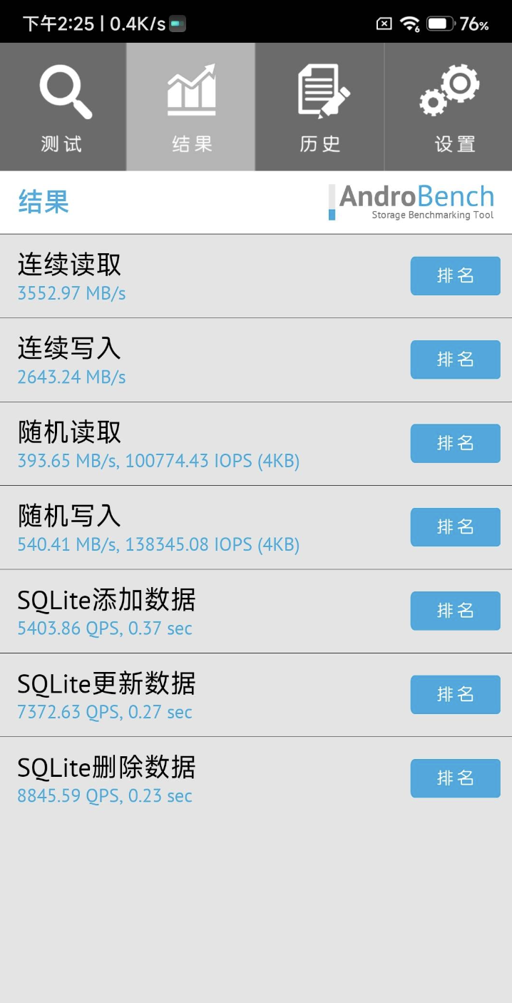 其次是AndroBench环节,这一环节主要是测试手机的闪存速度如何,闪存速度与应用开启速度、加载速度以及文件传输速度有着不可分割的关系。