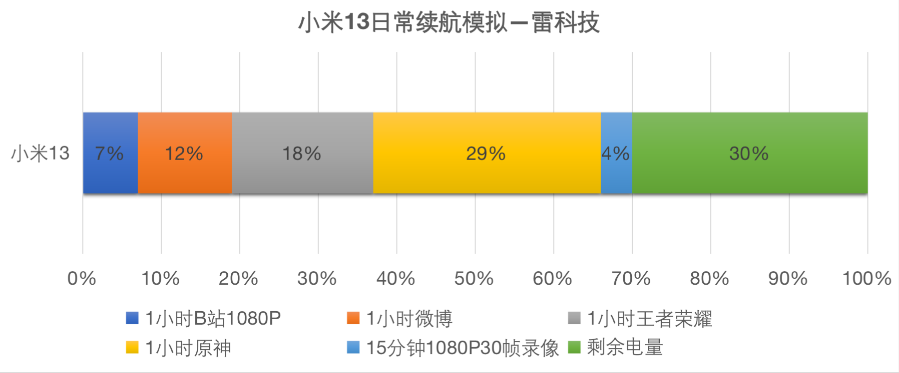 说完游戏和性能表现后,我们再来看看它的续航表现如何,毕竟真正天天拿着手机玩游戏的用户仍是少数,大多数用户更在意的是它的续航表现如何,出门时需不需要额外带个充电宝。为此我也简单建立了一个模拟日常使用的模型,看看这台只有4500mAh电池的小米13在经过四小时高强度测试后还能剩余多少电量吧。