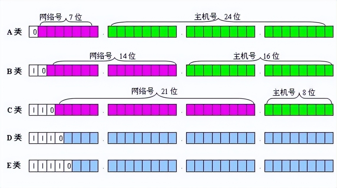 为了便于对网络进行管理,IP地址被分成了A、B、C、D和E五类。其中A类、B类、和C类这三类地址用于TCP/IP节点,其它两类D类和E类被用于特殊用途。