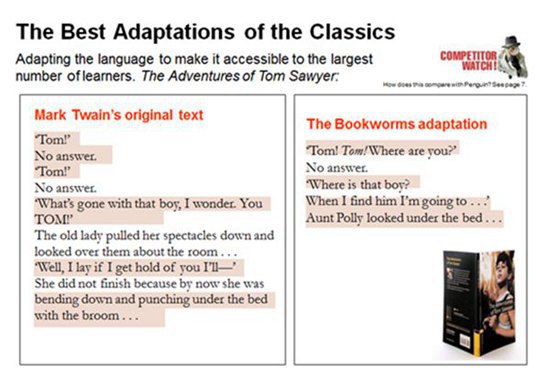 芭斯特强调,重写经典小说并不仅是简化语言和缩短长度。“成功的改写,首先要遵守的原则,就是符合原著中作者的原意。所以,必须详细分析原著,包括其叙事结构、人物描写、修辞格……之后,改写者要建立一套全新的叙事结构,遵守‘书虫’系列各个分级类别的用词原则,根据原著的核心精神,创建全新的文本。”