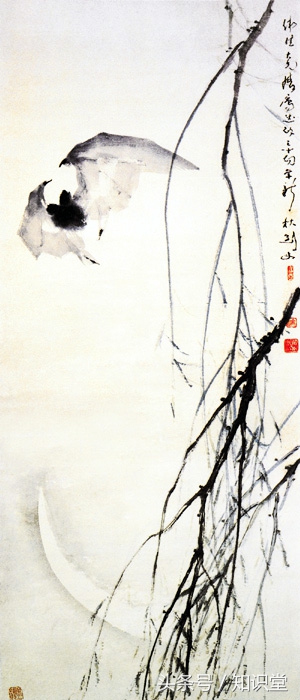 (1)《蝙蝠迎风图》,作者高剑父,此图将蝙蝠的头部用深墨大点,因宣纸的洇透,四周有毛茸茸的感觉,蝙蝠的鼻尖上翘,两点深墨画出二只大耳朵,左右翼的设置,根据蝙蝠双翅的结构,翼尖加深墨,蝙蝠的形象颇为生动。画面右旁,数株柳条,中锋出之,添上叶子,画面重点突出,富有新意。