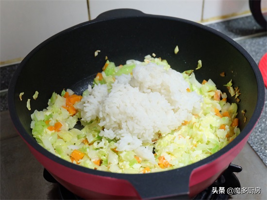4、放圆白菜碎,继续翻炒。我是为了让自己少吃点米饭, 所以多放了圆白菜;