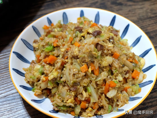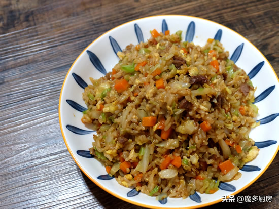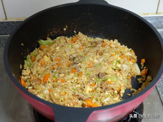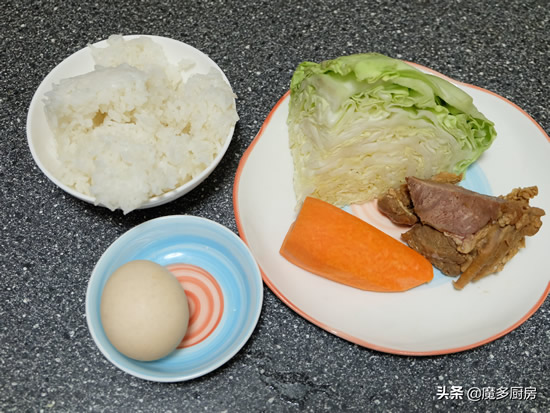 【需要的食材和调味料】:米饭1碗、鸡蛋1个、胡萝卜小半根、酱牛肉1小块、圆白菜小半个、食用油、酱油;