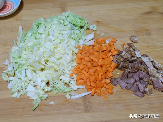 2、将圆白菜切碎,胡萝卜去皮切小丁,酱牛肉切小丁,备用;