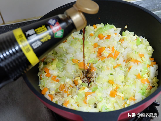 9、翻炒均匀后,再倒入酱油。尽量选择鲜味足但又不太咸的酱油, 炒出来会更好吃;