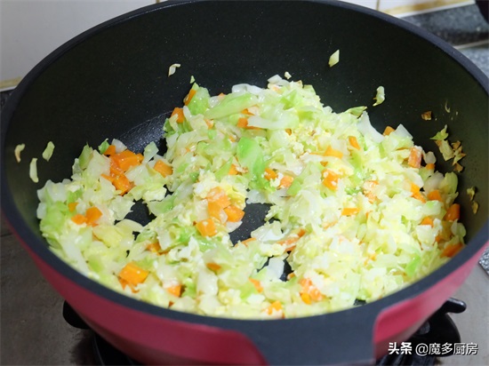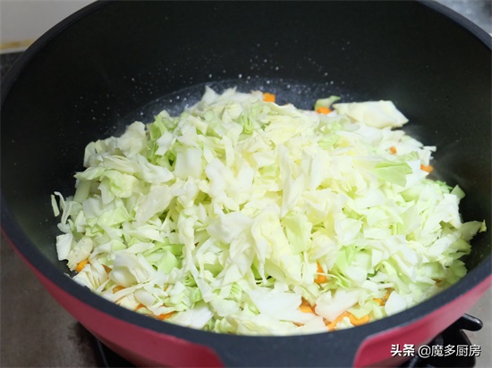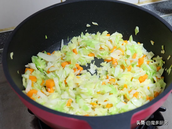 5、翻炒至圆白菜断生,明显锅里没有那么多蔬菜了;