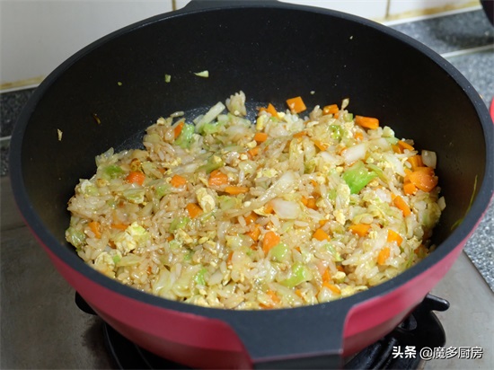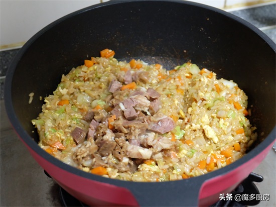 10、翻炒均匀,锅里这些饭看着挺诱人的吧!