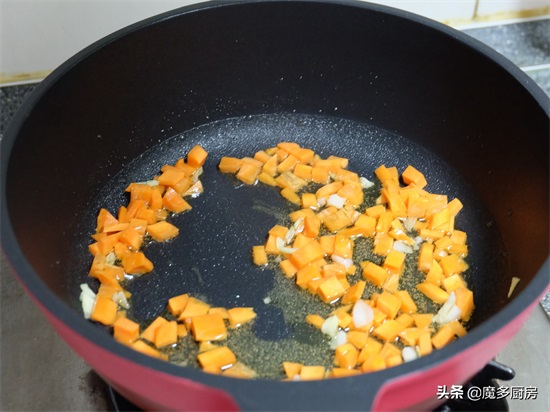 3、炒锅上火烧热,放食用油,放胡萝卜丁翻炒30秒到1分钟;