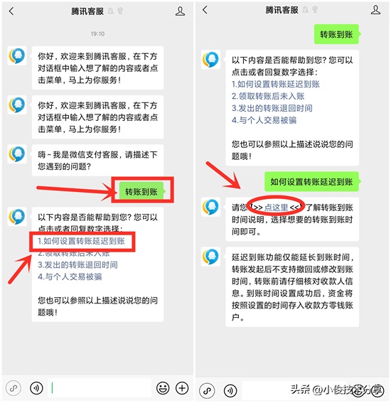 接着就会进入到客服页面,在这边我们输入【转账到账】,然后选择【1、如何设置转账延迟到账】,然后按要求点击下方的【点这里蓝字】