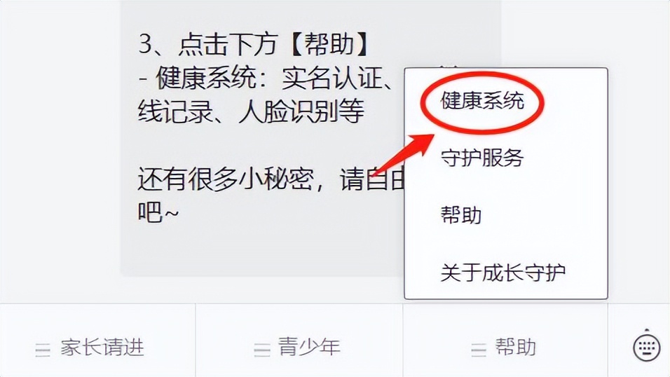 第二步:进入公众号,点击右下角“帮助”,再点击“健康系统”;