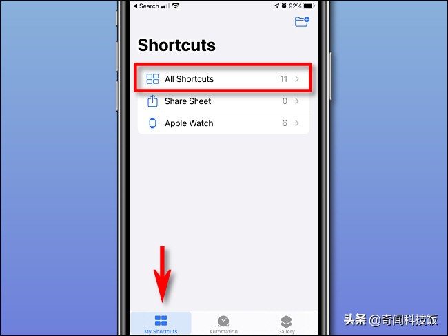 如果在应用打开时看到“快捷方式”概述屏幕,请点击“我的快捷方式”选项卡,然后选择“所有快捷方式”。