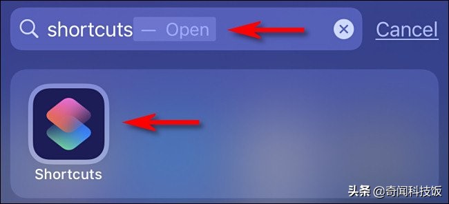 要打开和关闭手电筒,我们需要使用内置的快捷方式应用程序创建自定义快捷方式。 为此,请打开“快捷方式”。 如果找不到,尝试Spotlight搜索:用一根手指从主屏幕中间向下滑动。 在搜索栏中输入“快捷方式”,然后点击“快捷方式”图标。
